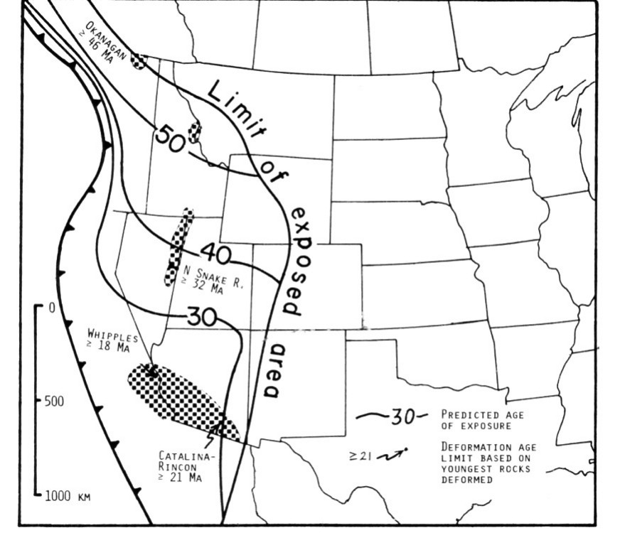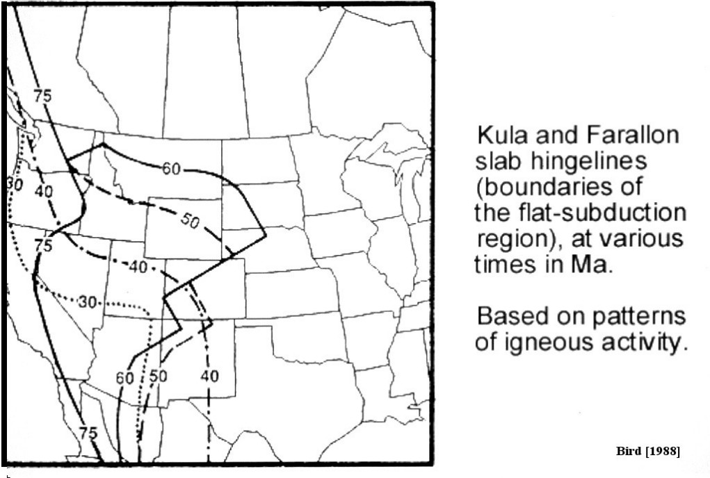 Abstract. One hypothesis for the formation of the Rocky Mountain structures in Late Cretaceous through Eocene time is that a plate of oceanic lithosphere was underthrust horizontally along the base of the North American lithosphere. The horizontal components of the motion of this plate are known from paleomagnetism, and the edges of the region of flat slab can be estimated from reconstructed patterns of voicanism. New techniques of finite-element modeling allow prediction of the thermal and mechanical effects of horizontal subduction on the North American plate. A model that has a realistic temperature-dependent rheology and a simple plane-layered initial condition is used to compute the consequences of horizontal underdthrusting in the time interval 75 million to 30 million years before present. Successful predictions of this model include (i) the location, amount, and direction of horizontal shortening that has been inferred from Laramide structures; (ii) massive transport of lower crust from southwest to northeast; (iii) the location and timing of the subsequent extension in metamorphic core complexes and the Rio Grande rift; and (iv) the total area eventually involved in Basin-and-R.ange style extension.