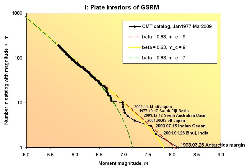 Figure 2. Frequency/magnitude plot of the 189 shallow intraplate earthquakes from Figure 1. Also shown are 3 tapered Gutenberg-Richter model curves (Jackson and Kagan, 1999; Kagan and Jackson, 2000). All models have the same asymptotic spectral slope of β = 0.63, but differ in the choice of corner magnitude mc. While the match to the curve with corner magnitude of 9 appears best, it must be noted that this depends on the size of the single largest earthquake.