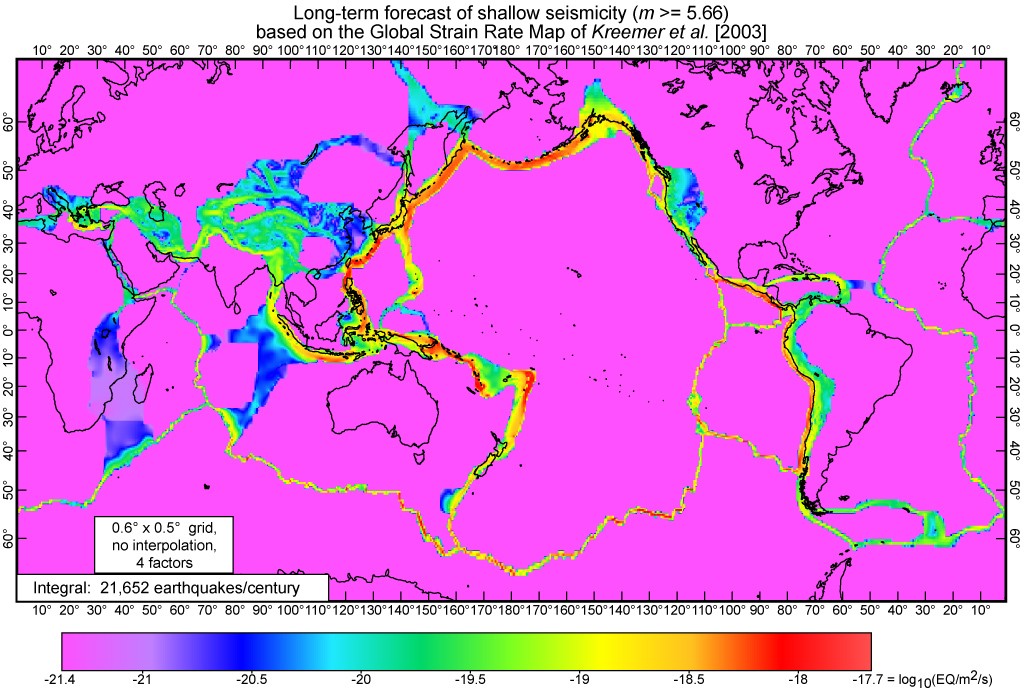Figure 3. SHIFT/GSRM global long-term forecast of the rates of shallow earthquakes above mT = 5.66. This model has been adjusted to match global shallow earthquake rates from CMT in 1977-2009.03 by using one free parameter for each of four deformation regimes, and one for the intraplate area. Rates are expressed as earthquakes per square meter per second, including aftershocks. Coloring of the map employs a logarithmic scale to express variations across almost 4 orders of magnitude from peak subduction-zone rates to intraplate rates. Mercator projection.